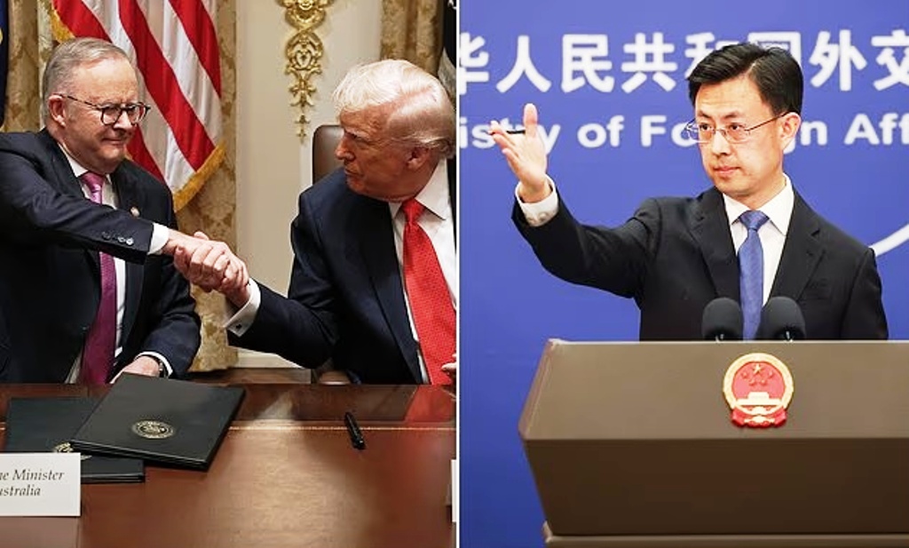 Flags of Australia and U.S. adorn the Eisenhower Executive Office Building of the White House in Washington, on Oct. 21, 2023. Daniel Slim/AFP via Getty