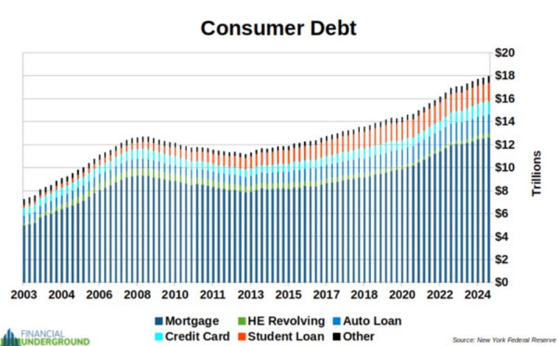 Amid rising prices, consumer debt is skyrocketing. It is at an all-time high of nearly $18 trillion, as seen in the chart below.