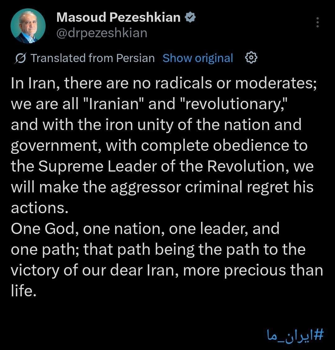 Iranian President Masoud Pezeshkian: In Iran, there are no Radicals or Moderates; we are all “Iranian” and “Revolutionary,” and with the Iron Unity of the Nation and Government, with Complete Obedience to the Supreme Leader of the Revolution, we will make the Aggressor Criminal Regret his Actions