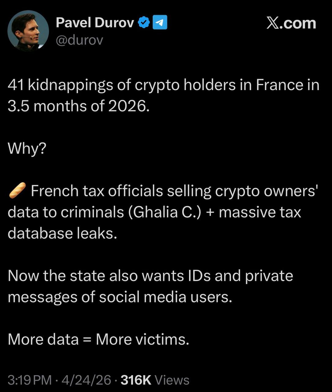 Telegram Founder Pavel Durov Alleges French Tax Authorities Sold Crypto Users’ Data, Which He Claims has Contributed to 41 Kidnappings this Year
